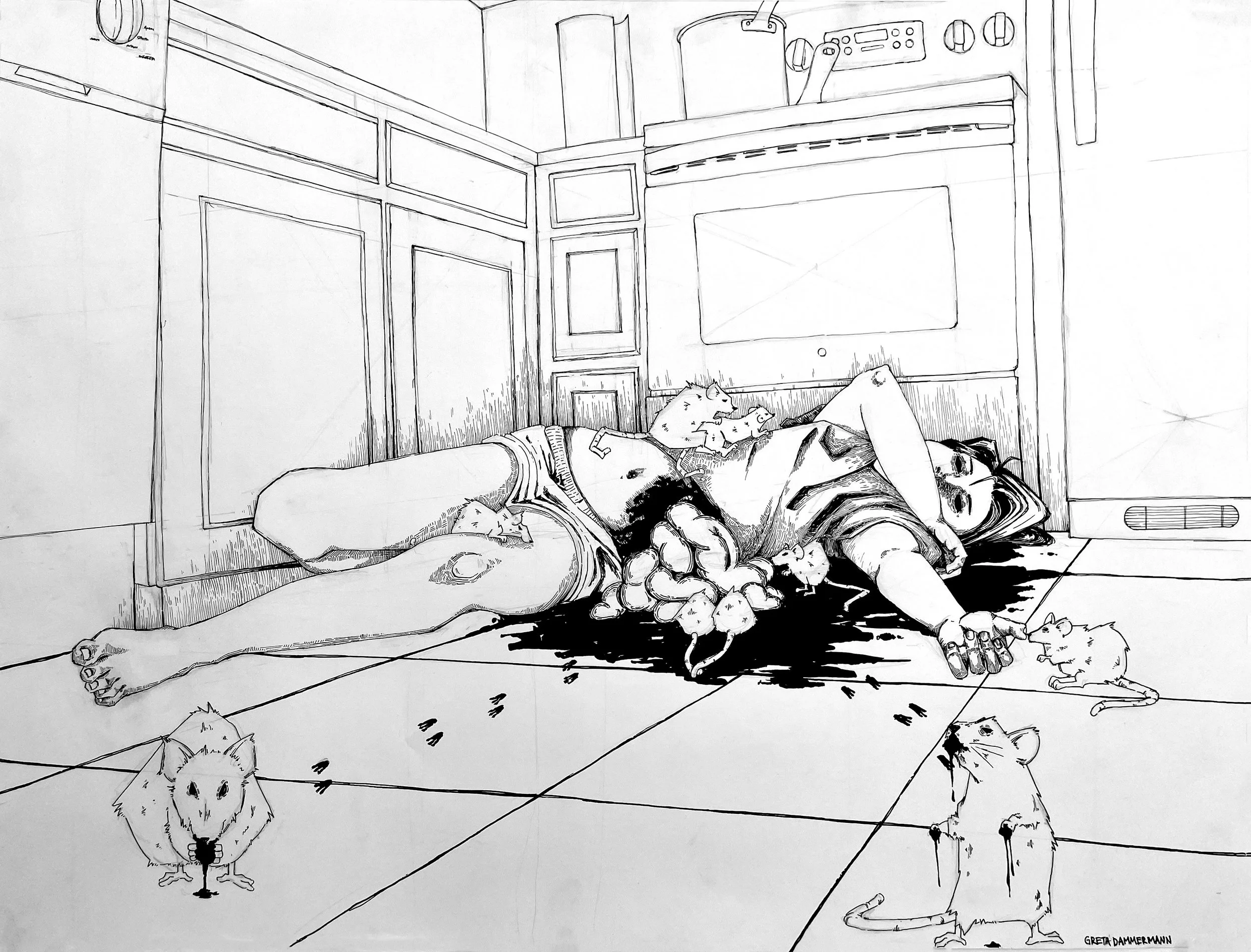 In this piece I have tried to create a sort of a metaphorical scene. A girl is lying dead on the floor while the rats devour her. I’d like to think that this piece holds a few meanings. For one, It shows the reality of nature. The lack of compassion expressed by the rats for the dead girl as they copulate on top of her dead body shows that mother nature knows only survival of the fittest. Another meaning I hope to express here is almost vengeful. I feel we as humans hold rats at such a low standard and believe them to be pests who don't belong on the streets or in our houses, when yet the rats have probably existed off the land much before we put the concrete down. I wanted to empower the rats in this piece as the main characters, taking care of an intruder in their habitat.